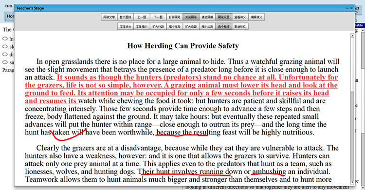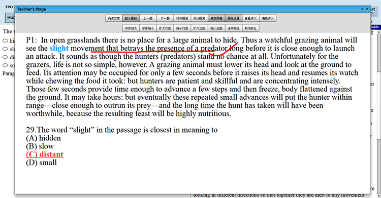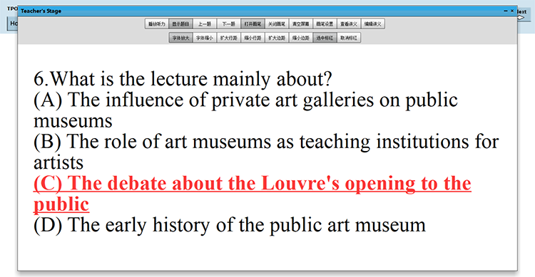 如何显示题目:系统会自动加载当前试题当前部分的试题。比如在TPO55阅读里面打开老师的舞台,自动加载55阅读试题。