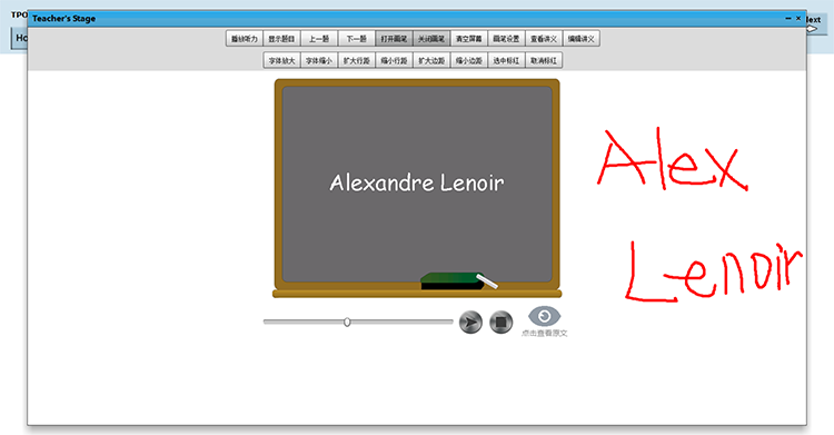Teacher's Stage 老师的舞台是老师教学的功能,方便老师使用投影仪放大显示给学生练习,也可以使用画笔绘图,方便老师教学展示。该功能支持阅读、听力、口语、写作界面展示,因此对于老师来说是一个福音,对于那种班课使用投影仪的很方便,可以放大缩小字体、也可以调整行距等。